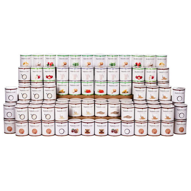The kits all contain a one-year supply of food, and are made up of nearly 100 1-gallon cans of wheat, rice, granola, apples, bananas, peaches, strawberries, potatoes, carrots, beans, onions, corn, beef, chicken, milk, sugar, and salt.